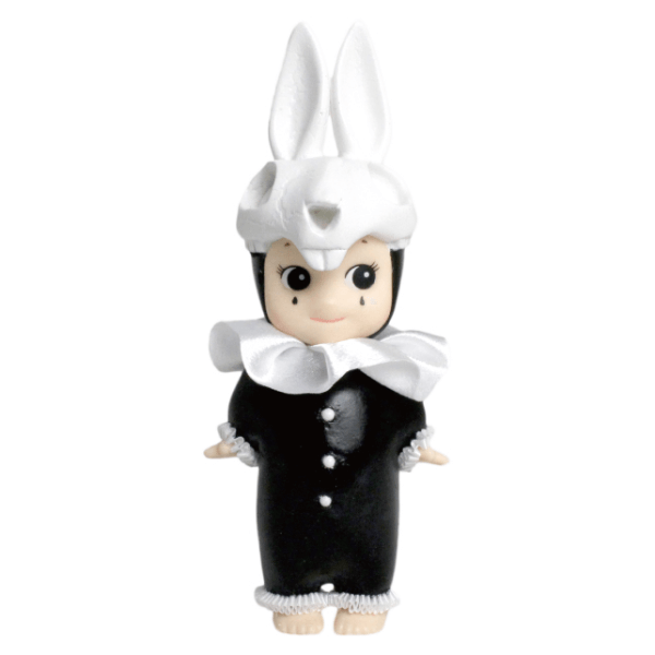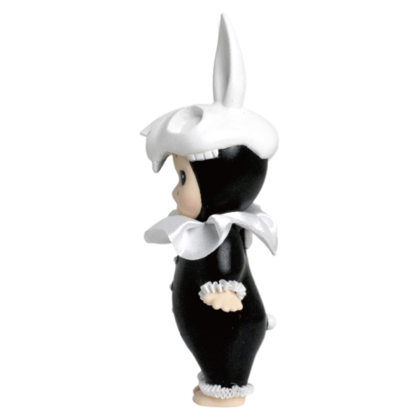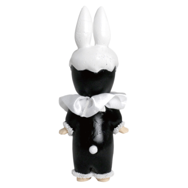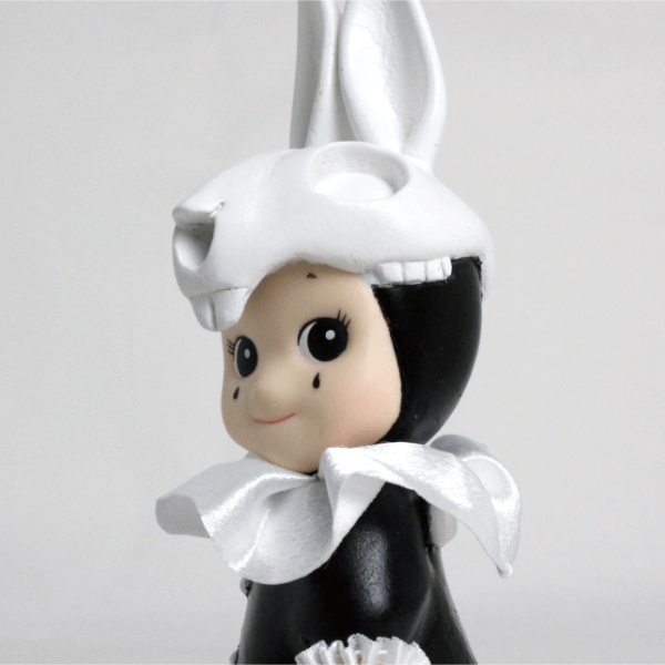 少しダークで仄暗いメルヘンをテーマに制作しました。普段は造形はしないので挑戦でした。頭蓋骨の形や、襞襟を付けるのに苦労しました。ソニーエンジェルの持つ可愛らしいフォルムの雰囲気や背中の羽などは残しつつ、私の絵に登場する骨やピエロといったモチーフをモノクロでまとめ、シックな空間にも合うruffらしいソニーエンジェルになったと思います。