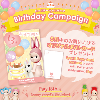 To celebrate Sonny Angel’s birthday (May 15th), we will be giving out a special postcard present to every order made during May at our Sonny Angel Store (online)!*